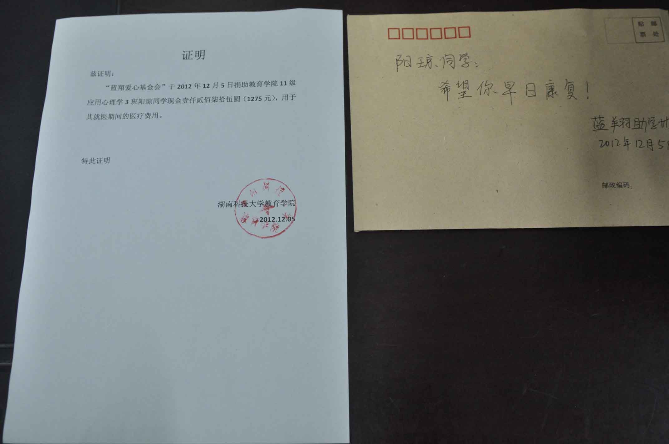 到目前为止,教育学院已通过募捐等活动,为阳琼同学筹到爱心善款4万余元。蓝翔助学协会的会长谭泽威表示,他们将在校园内开展一系列爱心活动募集善款,比如:校园一元捐(活动已通过校团委审批),这些后期的费用也会资助到阳琼手中。