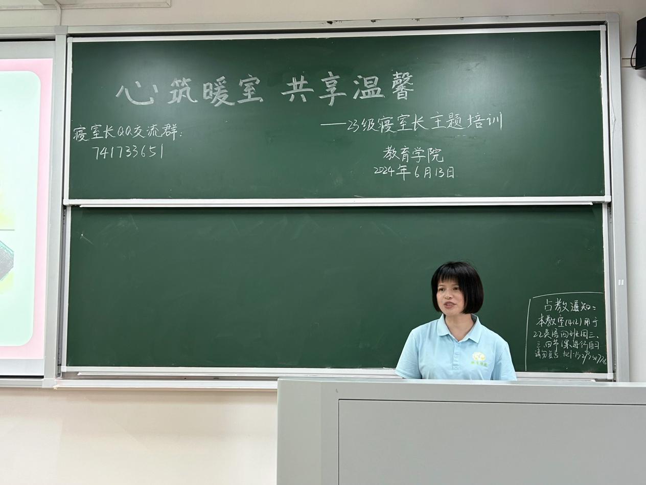 为进一步加强学生宿舍管理,增强寝室长的心理健康知识,6月13日,教育学院寝室长“心筑暖室,共享温馨”主题培训在第八教学楼412教室举行。学工办老师练素华主讲,23级寝室长参加。