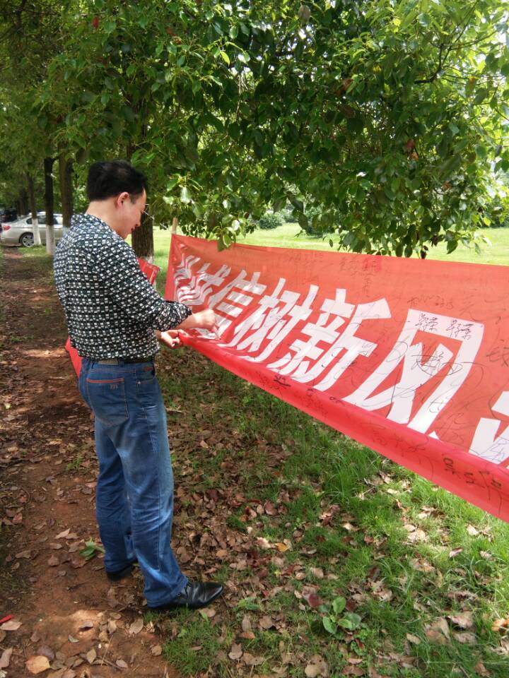 “讲诚信树新风建和谐校园,乐奉献知感恩筑正气中国”。 2016年5月30日,教育学院、数学与计算科学学院和外国语学院在北校七区联合开展了诚信宣传展板活动。三个学院的负责人早早拉起了横幅,将宣传展板,展台摆好,准备好诚信讲解内容和诚信快答问题,开始一天的宣传活动。