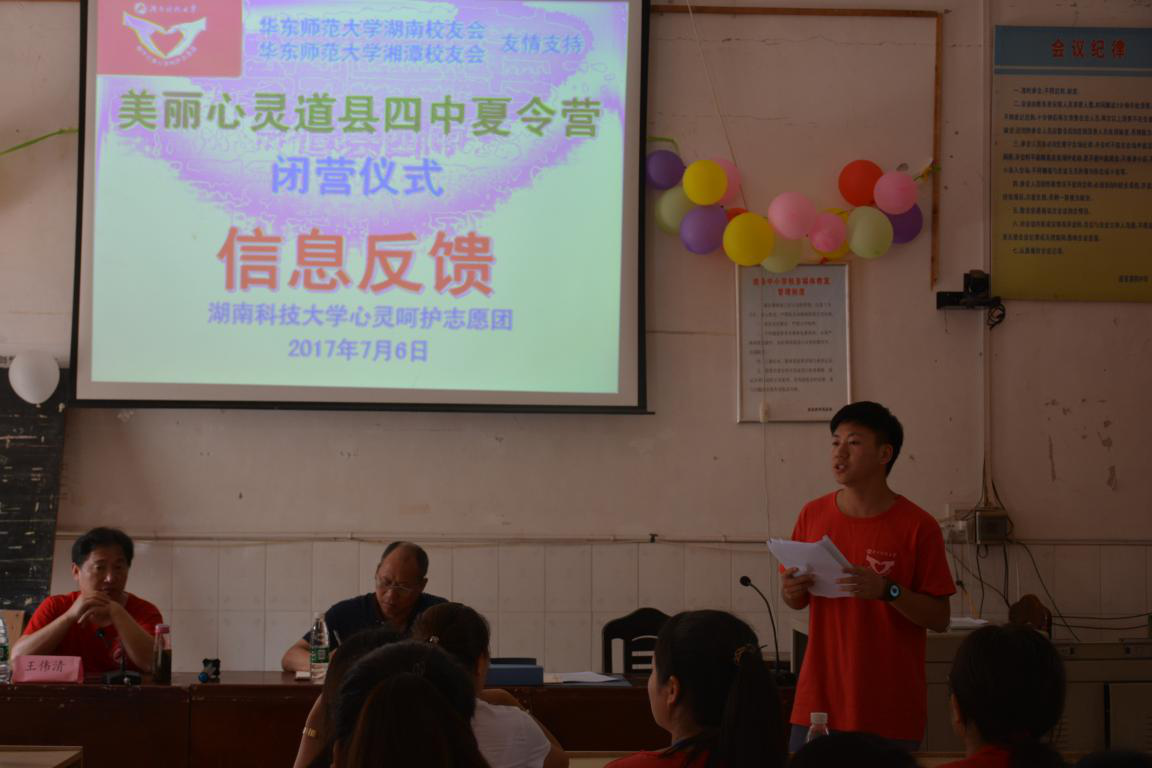 为给本次夏令营增添色彩,7月6日上午八点,“留守儿童心灵呵护志愿团赴道县科技服务志愿队”开展了文艺汇演。演出时,科技服务志愿队全体成员通过表演歌曲串烧、话剧、相声、手语表演、舞蹈等节目,与被试对象进一步沟通、接触,更加了解被试对象的心理情况。随后,“留守儿童心灵呵护志愿团赴道县科技服务志愿队”带领被试对象开展竞技游戏,通过“运气球”、“猜谜语”等活动。为鼓励被试对象积极参与活动,科技服务志愿队采取“积分制”的方式,设置不同的奖项,不仅激发了被试者的积极性,也增强了科技服务志愿队全体成员与被试对象之间的交流和互动,活动结束后,参与活动的全体成员进行签名留念。下午3点,“美丽心灵——道县四中夏令营”闭营仪式顺利开展。湖南科技大学留守儿童心灵呵护志愿团指导老师王伟清,道县四中校长胡仁与副校长蒋祖辉,道县四中团委书记李文波,道县四中班主任代表黄贵平,出席启动仪式,志愿队全体成员与道县四中各班班主任参与仪式。