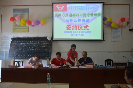 汇报会上,王伟清教授指出,本次活动旨在通过志愿队成员与被试对象之间的互动与交流,了解被试者的心理动态,并以此引导被试对象的家长、老师、同辈群体如何帮助被试者心克服心理障碍,促进气心理健康发展和品德的发展。同时,志愿团将会给每位重点呵护对象建档,志愿队成员将通过网络、书信等方式对重点呵护对象进行后续跟踪,从本质上帮助重点呵护对象。随后,举行了“道县四中校外心理辅导员聘任仪式”,并举行了“长期合作签约仪式”。
