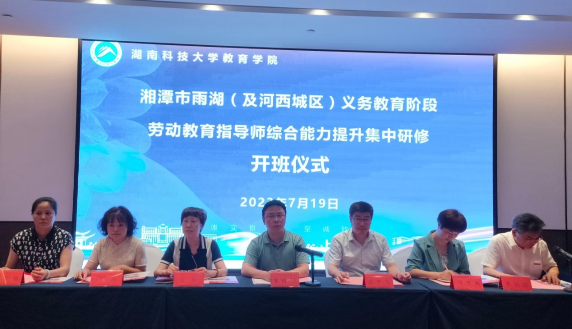 7月18日上午,国培计划“雨湖义务教育阶段劳动教育指导师综合能力提升集中研修”开班仪式在湘潭市华美达广场酒店举行。湖南科技大学党委委员、纪委书记、湖南省监委驻湖南科技大学监察专员 郭时印,湖南省教师发展中心副主任左梦飞,湘潭市教育局教师科科长谭京湘,雨湖区教育局党委委员、副局长王红,雨湖区教育局教育研究培训中心王璨,湖南太阳成集团tyc122cc入口党委副书记文红梅出席开班仪式。教育学院党委书记李炳煌主持。