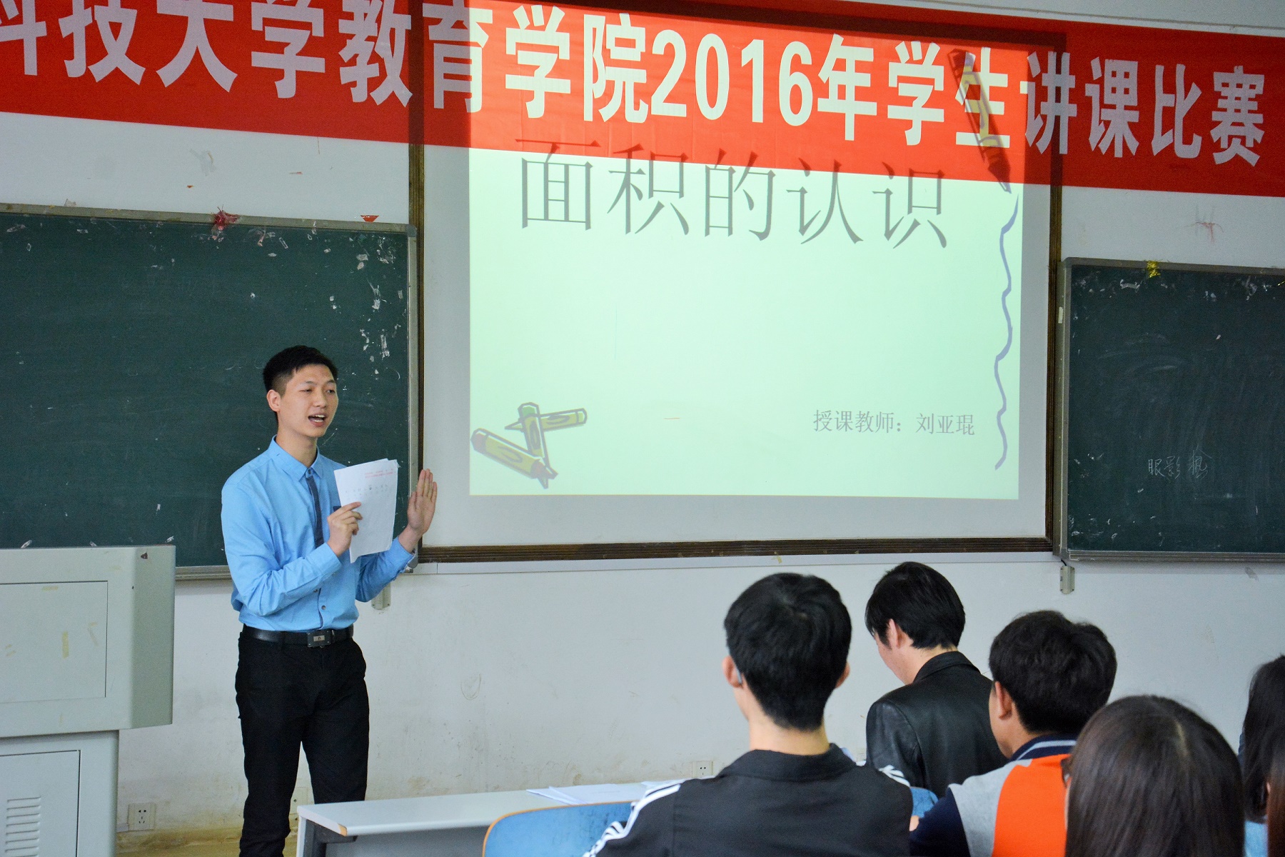 理科组由陈坤华副院长、王伟清副书记、陈京军主任、杨世伟主任、尹霞云博士等担任评委。理科组的第一位选手是来自2013级小学教育专业的兰雪,她用《喜羊羊与灰太狼》中的大草原吸引学生的注意力,顺势引入平行四边形的概念;随后安排学生进行小组讨论合作,并让他们上台展示成果,师生合作非常融洽。在课程结尾时,“兰老师”还以曹冲称象的例子强调“同学们要学会对信息的转化”,这使得本节课堂既完整又令人印象深刻。13级应用心理学2班的“刘亚琨老师”则着一袭西装,风度翩翩,他巧妙地通过让学生鼓掌感受面的概念。有条理地讲述了观察法、重叠法和数方格法,还称学生为与之共同闯关的小勇士,这种以好朋友相称、平等的师生关系赢得了阵阵掌声……