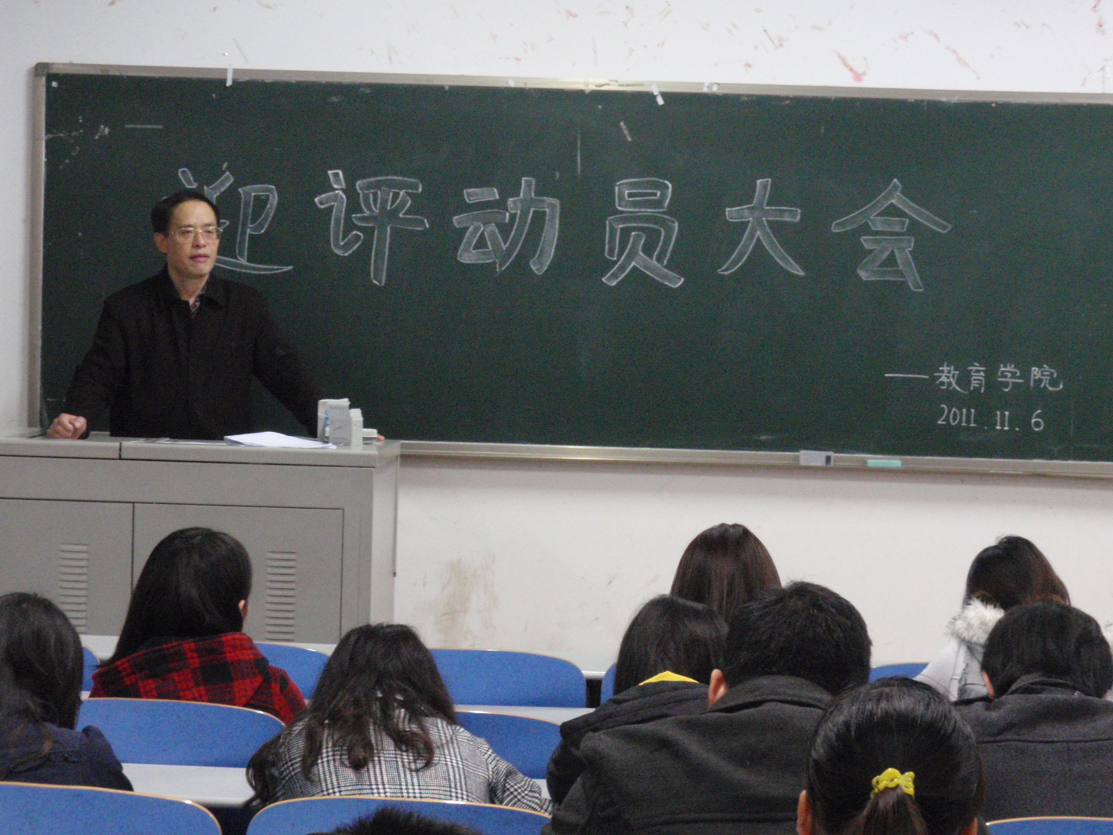 为了迎接本月7日至11日的湖南省研究生评估,11月6日晚上7点半,教育学院2011年迎评动员大会在八教105室成功召开。会议由院党委副书记王伟清主持,院长陈春萍教授、副院长周险峰教授、学工办练素华老师以及我院全体研究生与会。