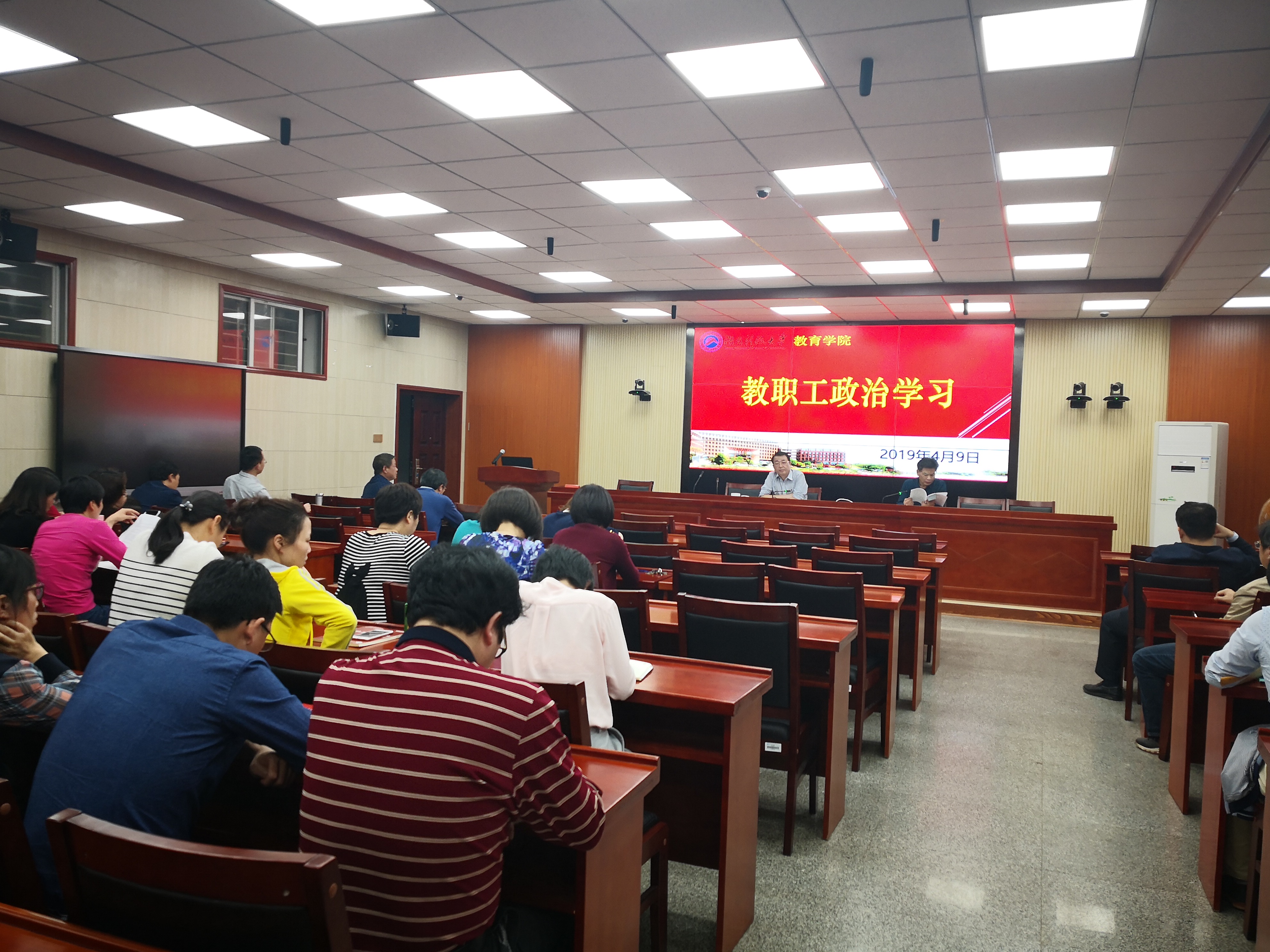 2019年4月9日下午,教育学院组织全体教职工在第八教学楼308会议室学习省教育厅党组书记、厅长、省委教育工委书记蒋昌忠,省纪委常委黄立峰,省纪委省监委驻省教育厅纪检监察组组长曹世凯三位领导同志在2019年全省教育系统全面从严治党工作视频会议上的讲话精神。会议由院党委书记李炳煌主持。