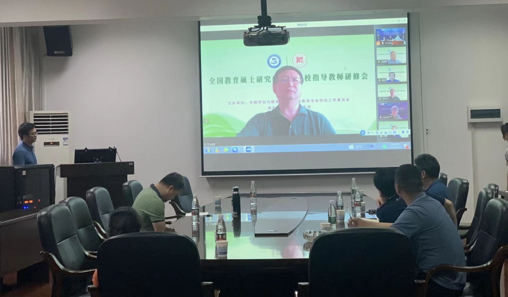 为进一步强化导师第一责任人切实履行立德树人职责,提高导师指导教育专业学位研究生学位论文的指导水平。6月11日,由中国学位与研究生教育学会教育专业学位工作委员会主办,贵州师范大学承办的全国教育硕士研究生培养院校指导教师研修会以线上线下相结合的方式开展,我校会议由教育硕士培养指导委员会组织,分会场设在化工楼310会议室,教育硕士专业学位(理科)硕士生导师参加了本次研修会。