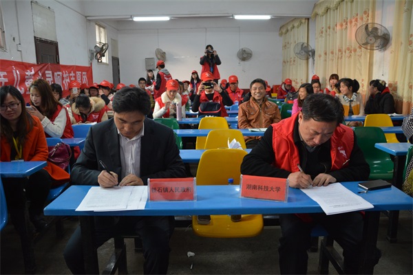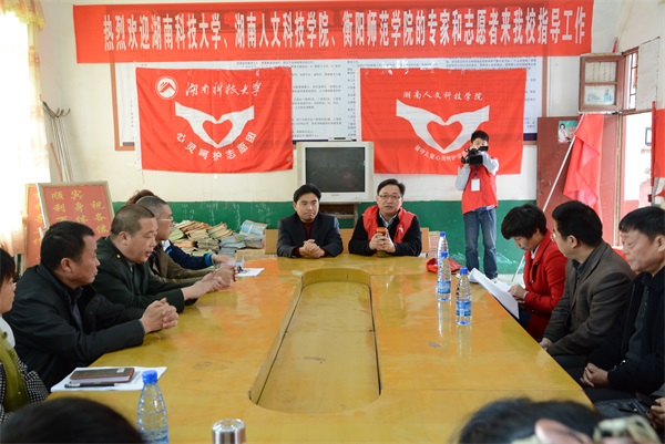 9:30全体成员抵达锁石中学,举行座谈会,出席会议的嘉宾有锁石镇党委副书记、人民政府镇长赵向阳,双峰县团县委书记邓涵提及妇联主席彭政毅,关工委副主任李良政等。会中,王书记就此次活动的目的及要求进行了简短说明,并说道,“本次活动是留守儿童心灵呵护志愿团模式继推广后与其他院校合作进行的,希望通过大家的努力,让'心灵呵护’这个活动能够更好的发展下去,帮助更多的孩子健康成长。”