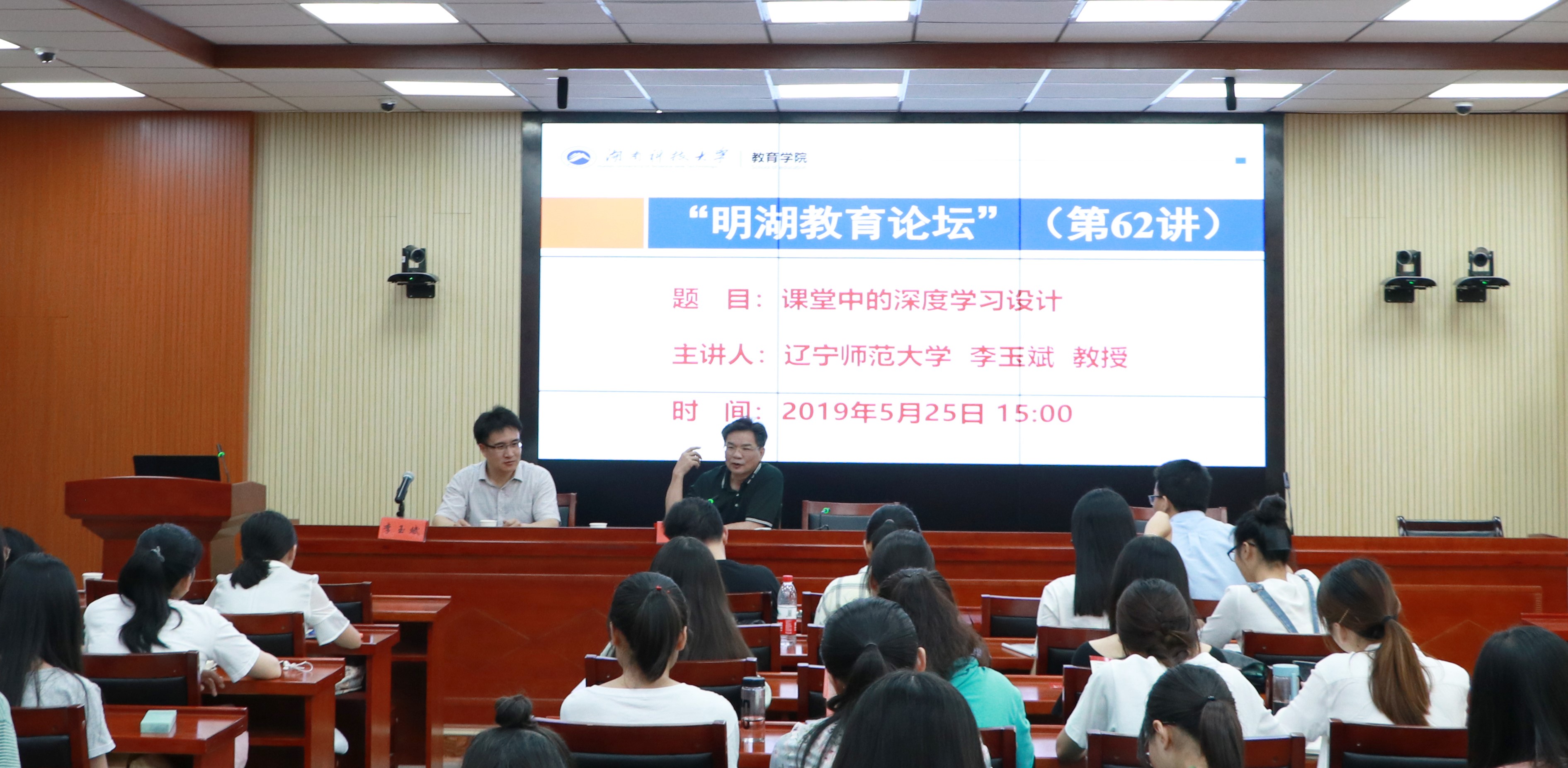 2019年5月25日下午,辽宁师范大学计算机与信息技术学院副院长,博士生导师李玉斌教授做客“明湖教育论坛”,为我院师生做题为“课堂中的深度学习设计”的学术报告。报告会由教育学院党委书记李炳煌主持。