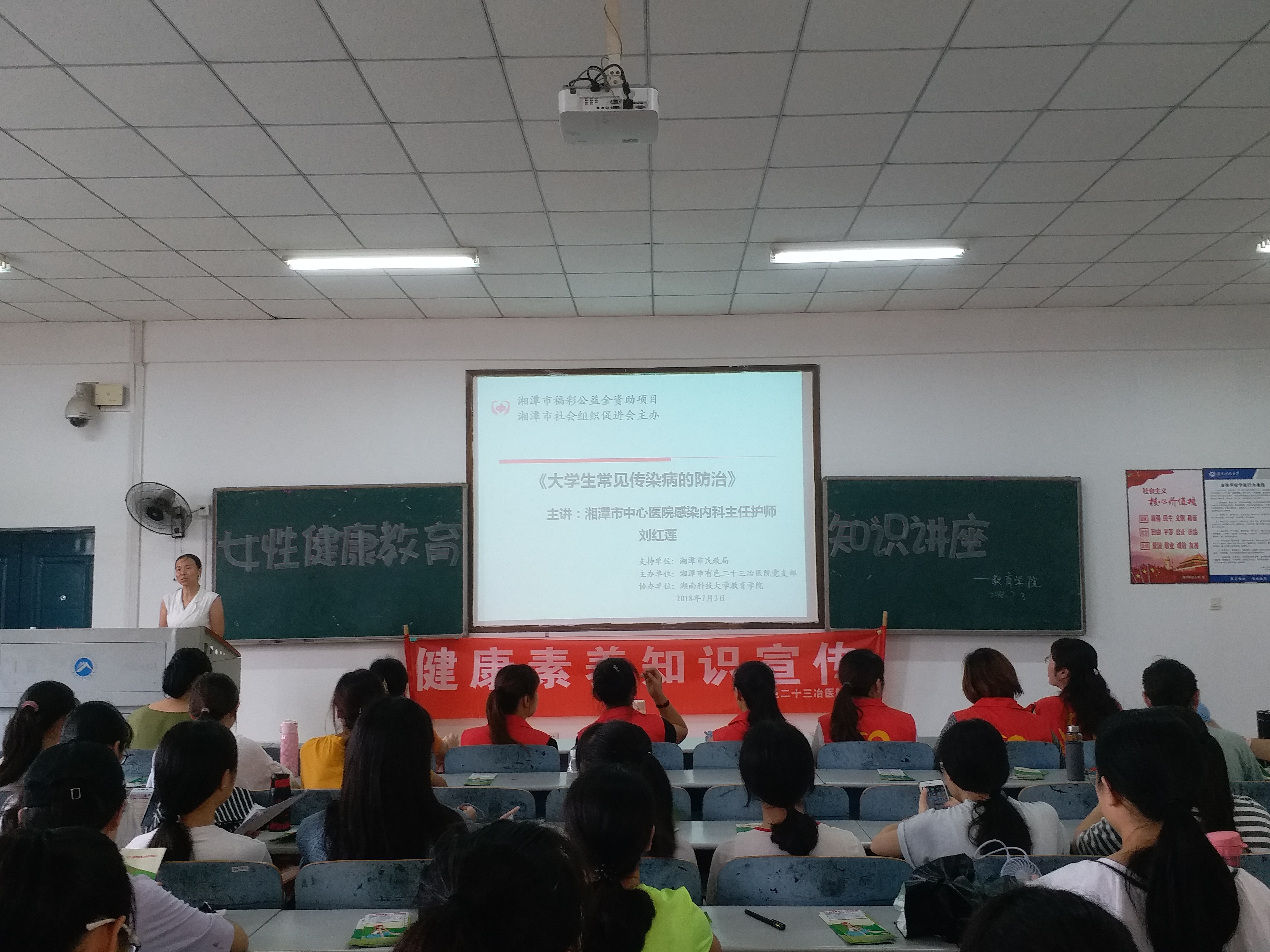 首先由湘潭市中心医院感染内科主任护师刘红莲主讲大学生常见传染病的防治,她从传染病流行爆发事件讲起,详细介绍了什么是传染病,传染病的预防,以及大学生常见传染病,如流行性感冒、麻疹、艾滋病等,对于学校传染病管理也提出了一些行之有效的建议。