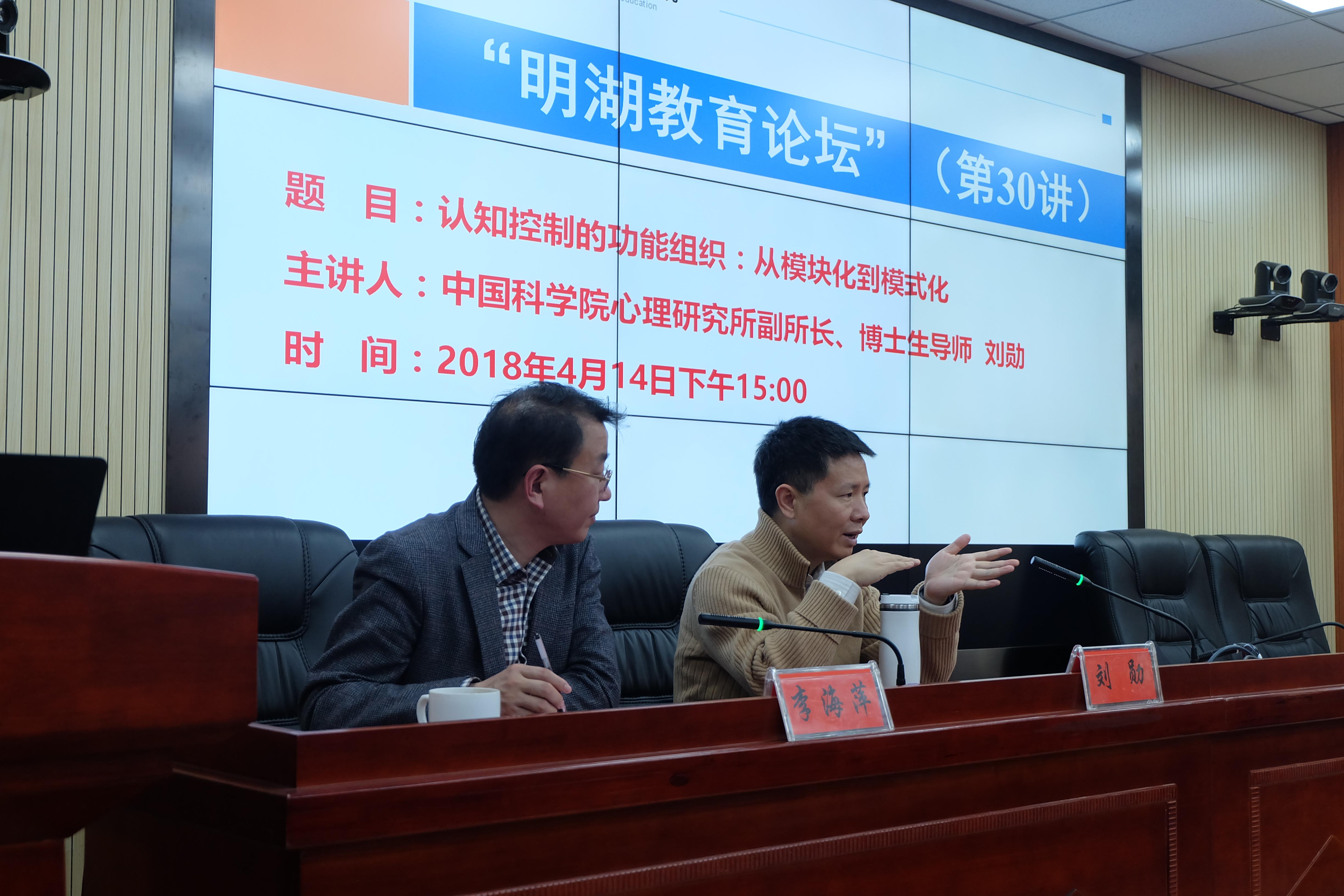 2018年4月14日下午,中国科学院心理研究所副所长、博士生导师刘勋研究员做客“明湖教育论坛”,为我院师生带来了主题为“认知控制的功能组织:从模块化到模式化”的学术讲座。教育学院教师代表、研究生与本科生代表到场聆听。讲座由教育学院院长李海萍主持。