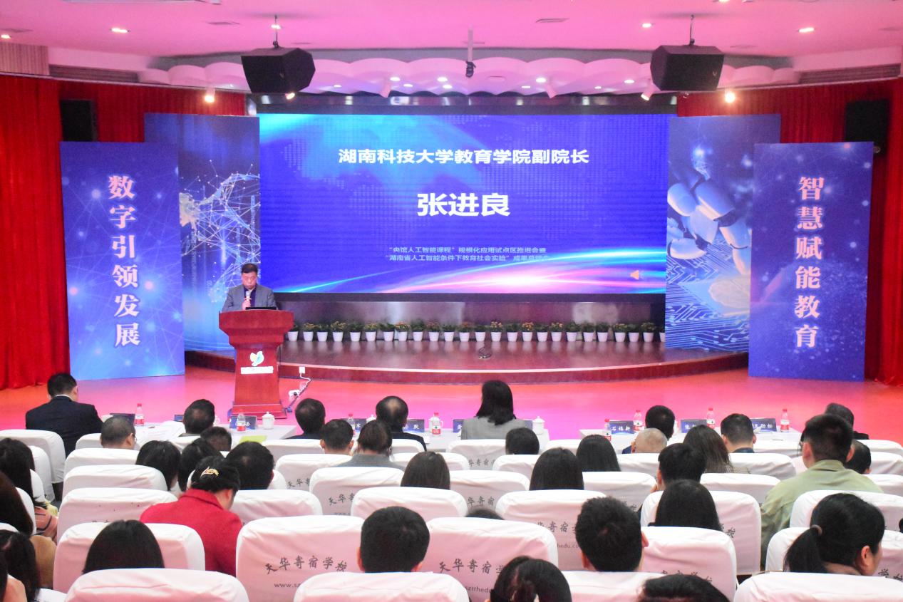副院长张进良在会上就联合培养研究生、加强校地合作等内容进行了分享交流,他表示将加强与试点区(试点校)的合作,选派研究生参与人工智能教育实践,缓解中小学人工智能教育师资不足等问题,为人工智能教育实践提供人力资源支撑。现场还举行了我校与湖南威阿智能科技有限公司共建的“湖南省研究生联合培养基地”授牌仪式。