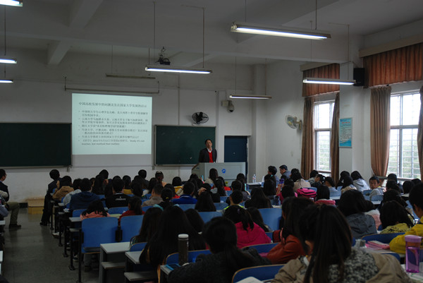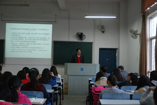 首先,谭书记对史秋衡教授作了隆重的介绍。史教授是厦门大学博士生导师、教育部基地厦门大学高教中心副主任、教育部普通高等学校本科教学水平评估专家组成员。史教授通过比较研究的方法,向我们展示了985高校、211高校、一般本科和专科学生在学情和专业选择发展上的差异。在本科学生学情方面,得出了“四个学年的学习基本处于一种马尔可夫链状态的结论;在专业发展方面,史教授认为专业教学过程是人才培养目标的载体。