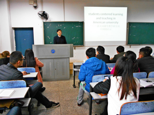 首先,副院长陈坤华对严文蕃教授作了隆重的介绍。严文蕃教授是美国波士顿麻州大学教育领导学系系主任、终身教授、博士生导师,美国教育研究会国家数据库研究小组主席,教育政策量化分析领域的大型数据与分析处理方面著名专家。严教授从学校建筑、课堂教学场景、课堂教学方式几个方面介绍了波士顿分校,体现了美国课堂教学以学生为中心的教学模式以及教育理念。