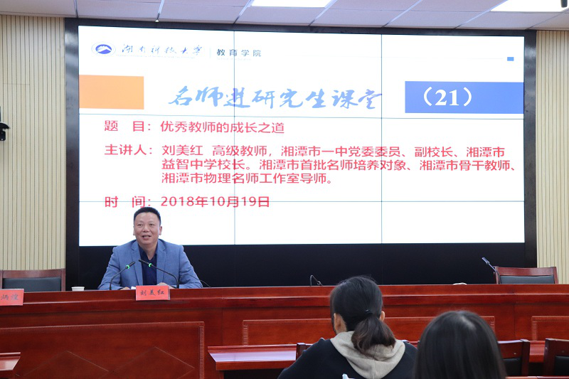 2018年10月19日下午,湘潭市益智中学校长刘美红做客“名师进研究生课堂”,为我院师生带来题为“优秀教师的成长之道”的报告。报告由教育学院党委书记李炳煌主持。
