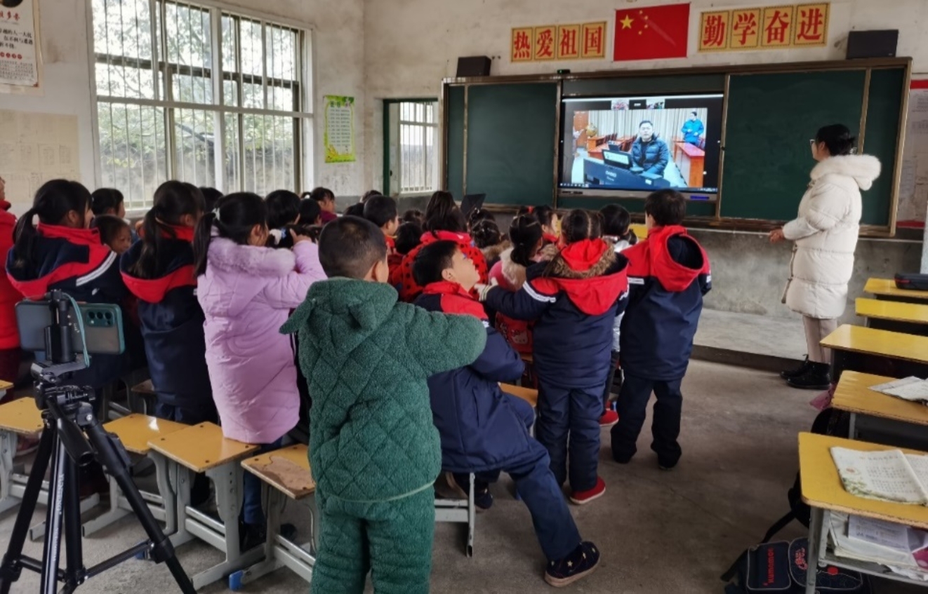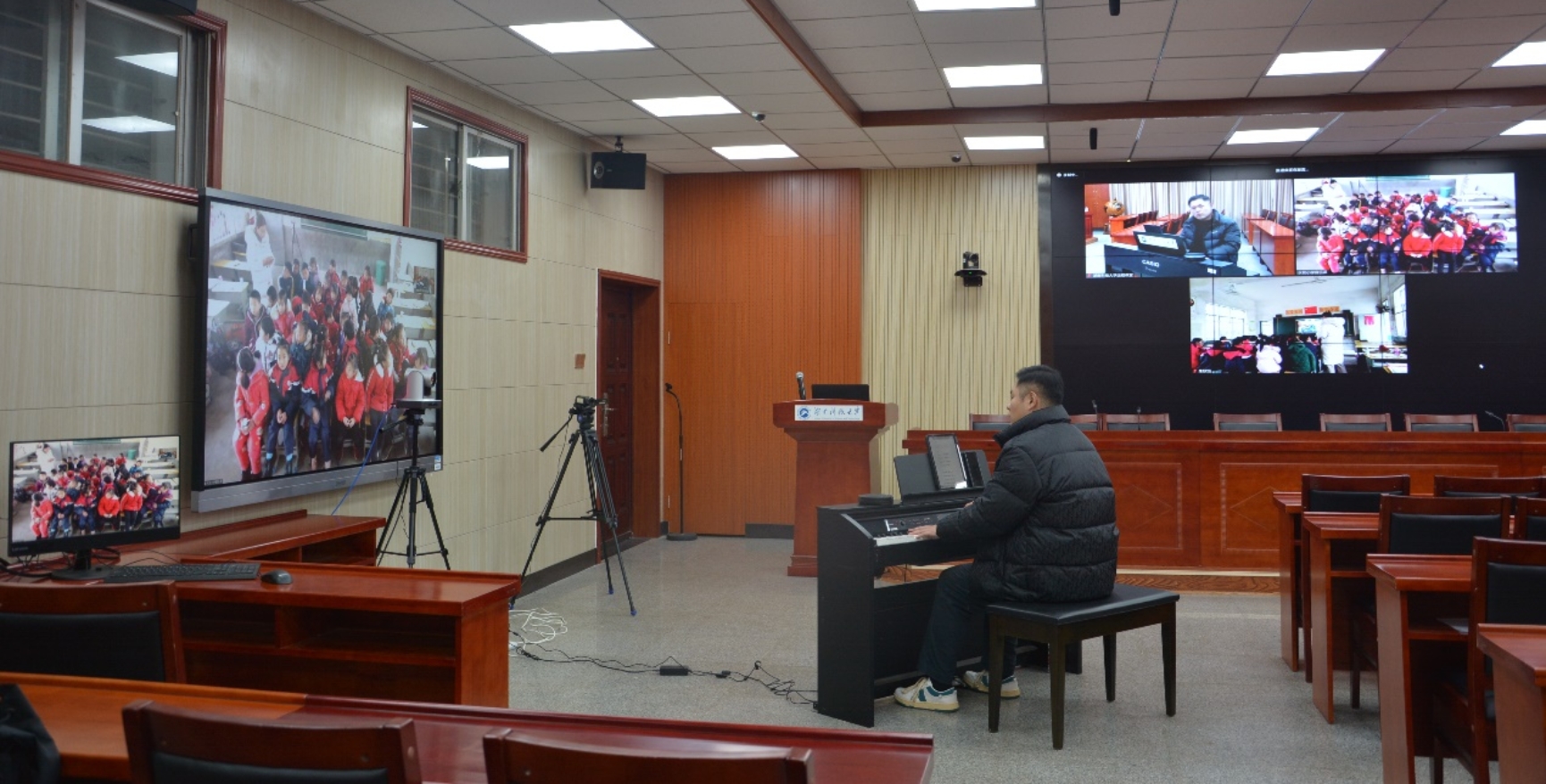 2021年12月29日上午,湖南太阳成集团tyc122cc入口、齐白石艺术学院与洞口县永发小学共同策划的第一节云音乐课正式开启。相隔254.9公里的两间教室通过联通云平台组建成云教室,近端是“心与馨”志愿支教服务队副队长2020级音乐与舞蹈学硕士研究生王传宝所在的湖南科技大学第八教学楼308远程直播互动教室,远端是我校“研究生志愿支教团”成员2021级现代教育技术专业领域硕士研究生朱欣怡所在的洞口县黄桥镇永发村小学二年级教室。